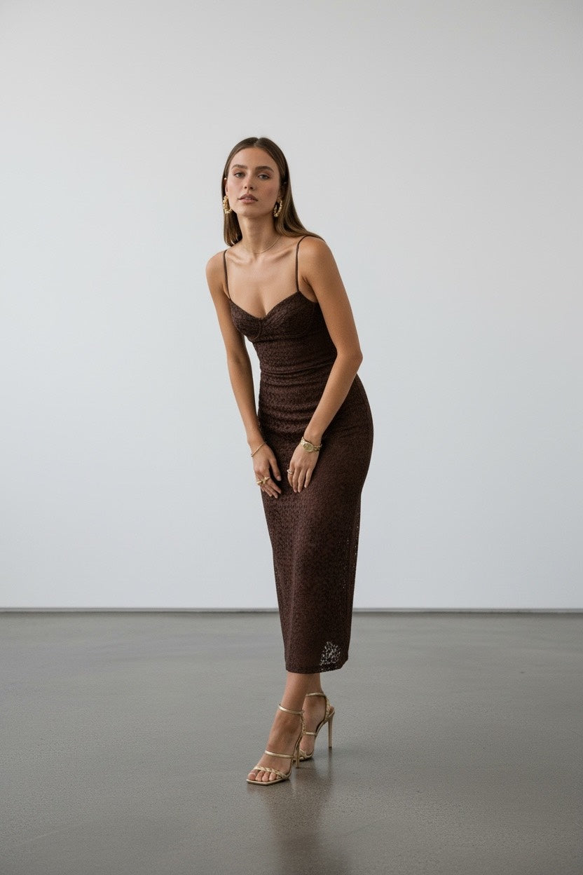 Elegante abito in pizzo che unisce sofisticatezza e comfort. Il delicato pizzo drappeggiato crea un effetto raffinato, perfetto per occasioni speciali e serate importanti. La lunghezza intera valorizza la silhouette con un tocco di classe senza tempo. Ideale per chi ricerca un capo versatile che passa dall'evento formale a cene eleganti con naturalezza. Un investimento nel guardaroba che non passa mai di moda.
