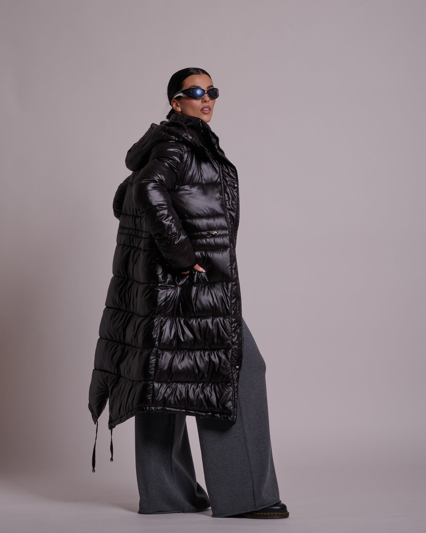 Piumino lungo in nero con cappuccio dotato di coulisse regolabile per un'aderenza personalizzata. Questo capo essenziale unisce funzionalità e eleganza, offrendo protezione ottimale durante i mesi più freddi. La silhouette allungata assicura copertura completa, mentre il cappuccio adattabile garantisce comfort in ogni condizione. Un investimento versatile per il guardaroba invernale.